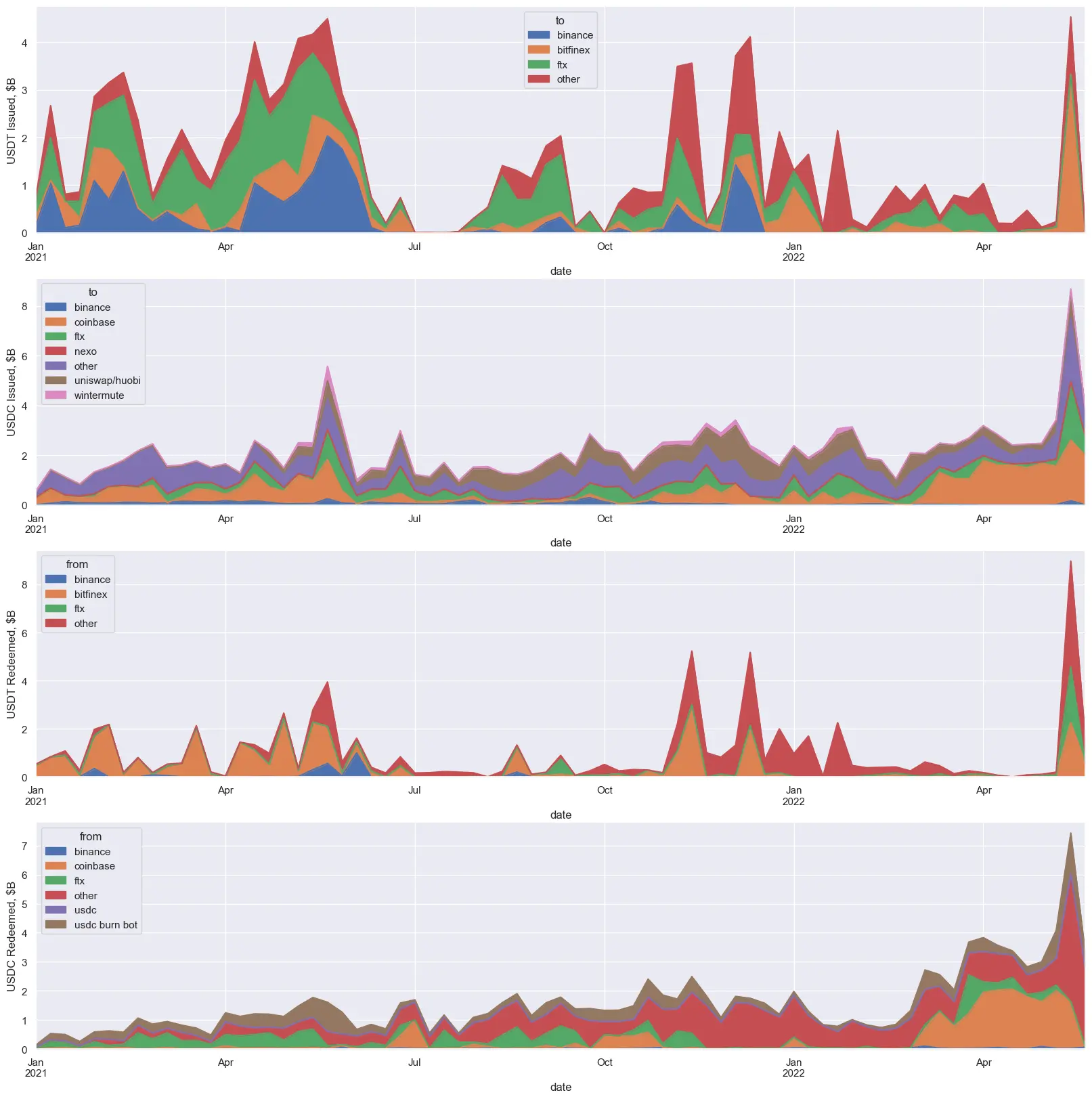 Note how in May 2022, in the collapse of the LUNA stablecoin, around $10B of USDT redemptions came in. Of this, around $5B was “USDT de-risking” where market makers swapped USDT for USDC.